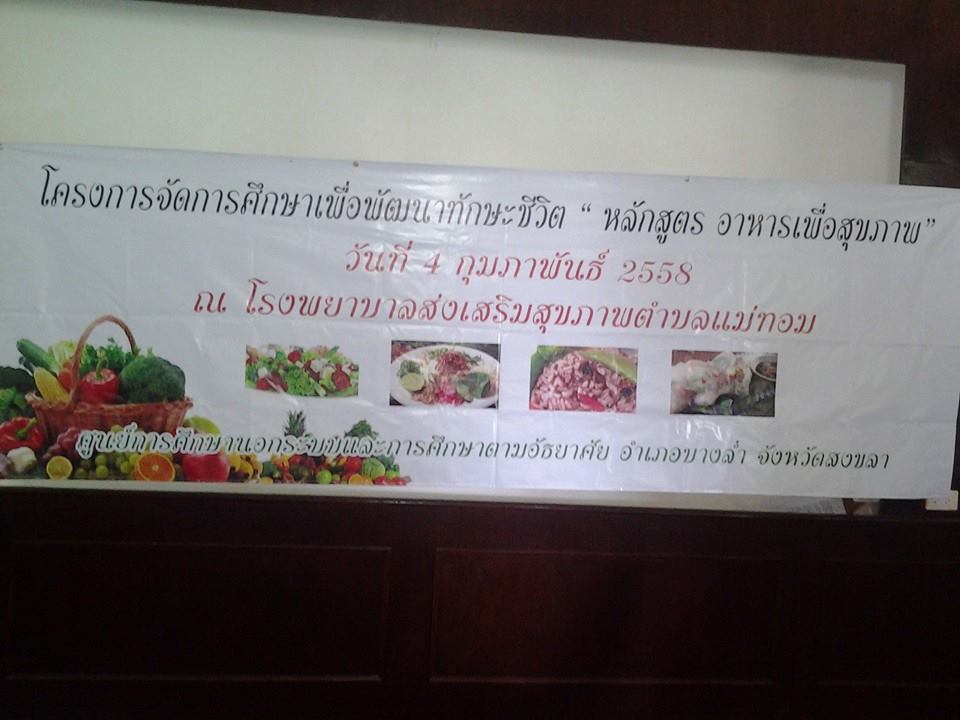 นายศิริพงค์ บัวแดง ผู้อำนวยการศูนย์ กศน.อำเภอบางกล่ำ มอบหมายให้คณะครู กศน.ตำบลบ้านหารและคณะครู กศน.ตำบลแม่ทอม จัดกิจกรรมโครงการจัดการศึกษาเพื่อพัฒนาทักษะชีวิต (อาหารเพื่อสุขภาพ) โดยมีนางวรรญา ทิพย์ดนตรี ผู้อำนวยการสำนักงาน กศน.จังหวัดสงขลา เข้าเยี่ยมชมการดำเนินการจัดกิจกรรมในครั้งนี้ ณ โรงพยาบาลส่งเสริมสุขภาพตำบลแม่ทอม เมื่อวันที่ ๔ กุมภาพันธ์ ๒๕๕๘ ที่ผ่านมา