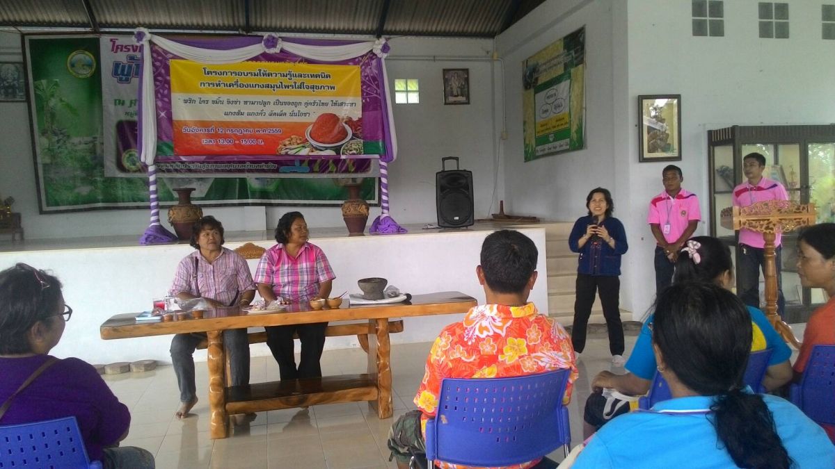 นายศิริพงค์ บัวแดง ผู้อำนวยการศูนย์การศึกษานอกระบบและการศึกษาตามอัธยาศัยอำเภอบางกล่ำ มอบหมายให้นางสุนีย์ แสนพิพัฒน์ , นางสาวสุธาทิพย์ นวลนิ่ม และ นางสาวณัฐกฤตา จอมศรี ตำแหน่ง ครู กศน.ตำบลท่าช้าง ร่วมกิจกรรมโครงการเปิดกลุ่มเครื่องแกงสมุนไพรเพื่อสุขภาพ โดยมีนักศึกษามหาวิทยาลัยราชภัฎสงขลา เป็นวิทยากรให้ครวามรู้ในครั้งนี้ ณ วันที่ ๑๒ กรกฎาคม ๒๕๕๙ ณ ศูนย์เรียนรู้เศรษฐกิจพอเพียงบ้านห้วยหลอ