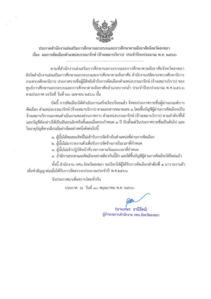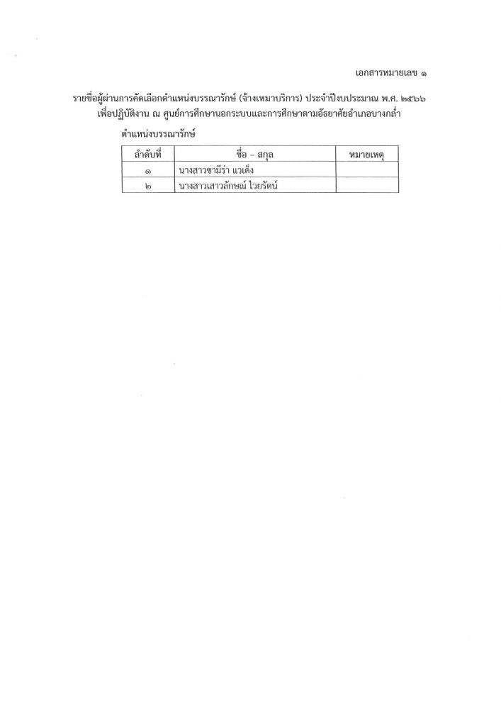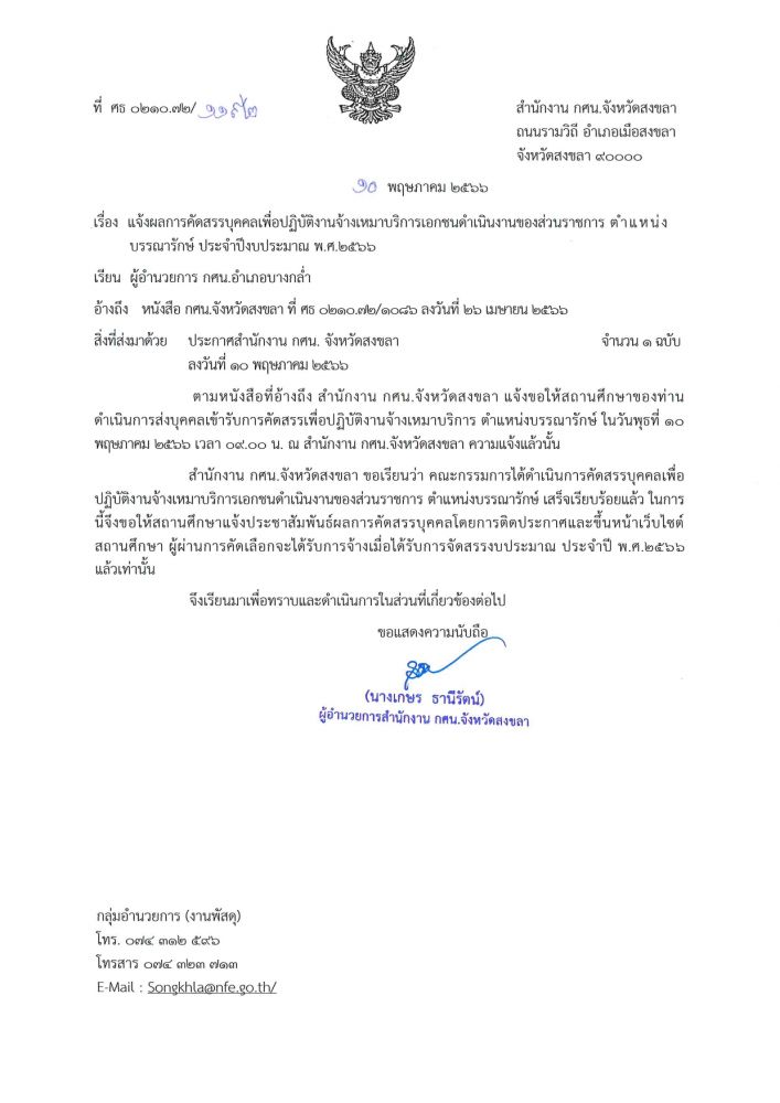 แจ้งผลการคัดสรรบุคลากรเพื่อปฎิบัติงานจ้างเหมาบริการเอกชนดำเนินงานของส่วนราชการ ตำแหน่งบรรณารักษ์ ประจำปีงบประมาณ พ.ศ.๒๕๖๖