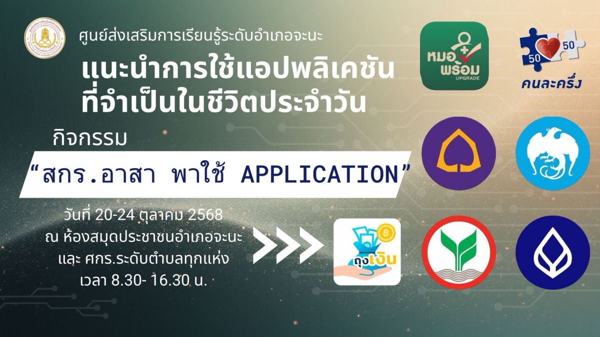 ข่าวประชาสัมพันธ์ ศูนย์ส่งเสริมการเรียนรู้ระดับอำเภอจะนะ จัดกิจกรรม \\\"สกร.อาสา พาใช้ APPLICATION\\\" แนะนำการใช้แอปพลิเคชันที่จำเป็นในชีวิตประจำวัน ระหว่างวันที่ 20-24 ตุลาคม 2568 ณ ห้องสมุดประชาชนอำเภอจะนะ และ ศกร.ระดับตำบลทุกแห่ง เวลา 8.30- 16.30 น.