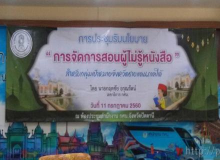 วันที่ 11 กรกฎาคม 2560 นางรุ่งเรือง จอมศรี ผอ กศน.อำเภอจะนะ เข้าร่วมประชุมรับนโยบายการจัดการสอนผู้ไม่รู้หนังสือ สำหรับกลุ่มเป้าหมายผู้ไม่รู้หนังสือในจังหวัดชายแดนภาคใต้ โดย ท่านกฤตชัย อรุณรัตน์ เลขาธิการ กศน. ณ ห้องประชุม สำนักงาน กศน.จังหวัดปัตตานี