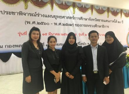 วันที่ 15 มีนาคม 2560 นางรุ่งเรือง จอมศรี ผอ.กศน.อำเภอจะนะ มอบหมายให้นายมู่ฮัมมหัด บิลล่าเต๊ะ และนางอามีเรา๊าะ ยูโซธะ เข้าประชุมพิจารณ์ร่างแผนยุทธศาสตร์ชายแดนใต้ ณ จังหวัดปัตตานี