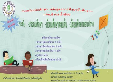 กศน.ตำบลน้ำน้อย เปิดรับสมัครนักศึกษา กศน.หลักสูตรการศึกษาขั้นพื้นฐาน ระดับประถมศึกษา มัธยมศึกษาตอนต้น มัธยมศึกษาตอนปลาย สมัครได้ที่ กศน.ตำบลน้ำน้อย หมู่ที่ 7 บ้านท่าจีน ต.น้ำน้อย อ.หาดใหญ่ จ.สงขลา สอบถามเพิ่มเติมโทร ครูแจ้ว 0862853833 ครูก้อย 0855912485 ส
