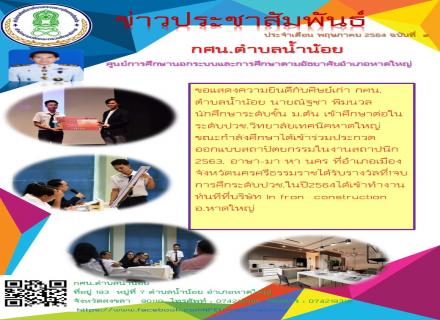 ขอแสดงความยินดีกับศิษย์เก่า กศน.ตำบลน้ำน้อย นายณัฐชา พิมนวล นักศึกษาระดับชั้น ม.ต้น เข้าศึกษาต่อในระดับปวช.วิทยาลัยเทคนิคหาดใหญ่ ขณะกำลังศึกษาได้เข้าร่วมประกวดออกแบบสถาปัตยกรรมในงานสถาปนิก2563. อาษา-มา หา นคร ที่อำเภอเมืองจังหวัดนครศรีธรรมราชได้รับรางวัลท