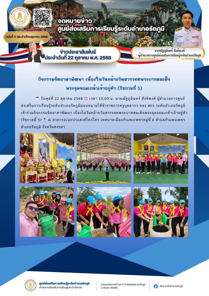 🗓️ วันพุธที่ 22 ตุลาคม 2568 ⏰ เวลา 10.00 น. นายณัฐภูมินทร์ สังข์พงศ์ ผู้อำนวยการศูนย์ส่งเสริมการเรียนรู้ระดับอำเภอรัตภูมิมอบหมายให้ข้าราชการครูบุคลากร ของ สกร.ระดับอำเภอรัตภูมิเข้าร่วมกิจกรรมจิตอาสาพัฒนา เนื่องในวันคล้ายวันสวรรคตพระบาทสมเด็จพระจุลจอมเกล้าเจ้าอยู่หัว (รัชกาลที่ 5) 📍 ณ อาคารอเนกประสงค์โคกไทร เทศบาลเมืองกำแพงเพชรหมู่ที่ 6 ตำบลกำแพงเพชร อำเภอรัตภูมิ จังหวัดสงขลา