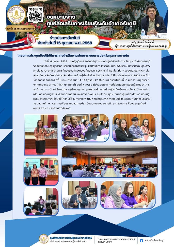 วันที่ 16 ตุลาคม 2568 นายณัฐภูมินทร์ สังข์พงศ์ผู้อำนวยการศูนย์ส่งเสริมการเรียนรู้ระดับอำเภอรัตภูมิ พร้อมด้วยคณะครู บุคลากร เข้าร่วมโครงการประชุมเชิงปฏิบัติการการดำเนินงานพัฒนาระบบการประกันคุณภาพ ภายในและนำมาตรฐานการศึกษาตามที่กระทรวงศึกษาธิการประกาศกำหนดไปใช้ในการประกันคุณภาพภายใน สถานศึกษา สังกัดสำนักงานส่งเสริมการเรียนรู้ประจำจังหวัดสงขลา ประจำปีงบประมาณ พ.ศ. 2568 ระยะที่ 2