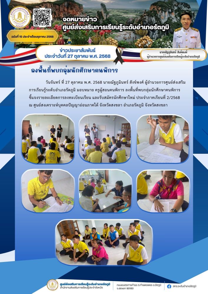 วันจันทร์ ที่ 27 ตุลาคม พ.ศ. 2568 นายณัฐภูมินทร์ สังข์พงศ์ ผู้อำนวยการศูนย์ส่งเสริมการเรียนรู้ระดับอำเภอรัตภูมิ มอบหมาย ครูผู้สอนคนพิการ ลงพื้นที่พบกลุ่มนักศึกษาคนพิการ ชี้แจงรายละเอียดการลงทะเบียนเรียน และรับสมัครนักศึกษาใหม่ ประจำภาคเรียนที่ 2/2568