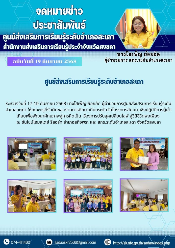 ศูนย์ส่งเสริมการเรียนรู้ระดับอำเภอสะเดา จัดโครงการสัมมนาเชิงปฏิบัติการผู้เข้าเทียบเพื่อพัฒนาศักยภาพสู่การคิดเป็น เรื่องการปรับลุคเปลี่ยนไลฟ์ สู่วิถีชีวิตพอเพียง 29 / ต.ค. / 2568