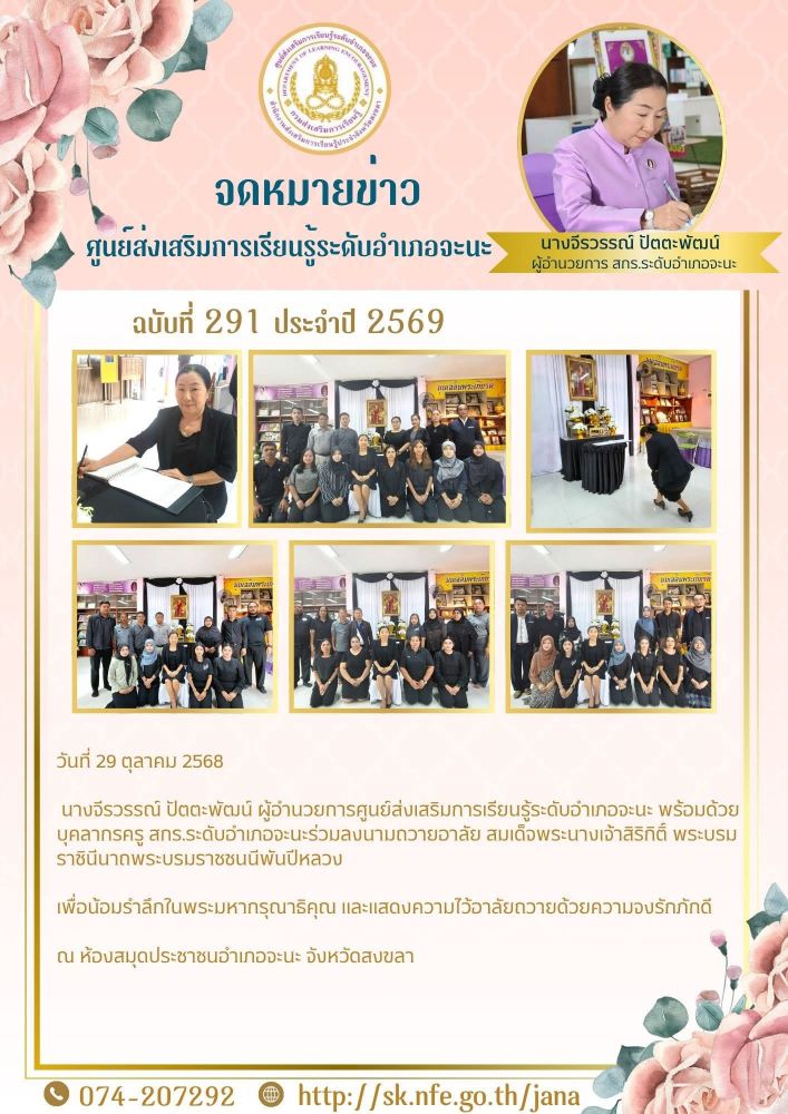 วันที่ 29 ตุลาคม 2568 นางจีรวรรณ์ ปัตตะพัฒน์ ผู้อำนวยการศูนย์ส่งเสริมการเรียนรู้ระดับอำเภอจะนะ พร้อมด้วยบุคลากรครู สกร.ระดับอำเภอจะนะ ร่วมลงนามถวายอาลัย สมเด็จพระนางเจ้าสิริกิติ์ พระบรมราชินีนาถพระบรมราชชนนีพันปีหลวง เพื่อน้อมรำลึกในพระมหากรุณาธิคุณ และแสดงความไว้อาลัยถวายด้วยความจงรักภักดี ณ ห้องสมุดประชาชนอำเภอจะนะ จังหวัดสงขลา