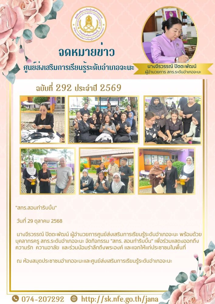 | วันที่ 29 ตุลาคม 2568 นางจีรวรรณ์ ปัตตะพัฒน์ ผู้อำนวยการศูนย์ส่งเสริมการเรียนรู้ระดับอำเภอจะนะ พร้อมด้วยบุคลากรครู สกร.ระดับอำเภอจะนะ จัดกิจกรรม "สกร. สอนทำริบบิ้น" เพื่อร่วมแสดงออกถึงความรัก  ความอาลัย  และร่วมน้อมรำลึกถึงพระองค์ และแจกให้แก่ประชาชนในพื้นที่ ณ ห้องสมุดประชาชนอำเภอจะนะ ศูนย์ส่งเสริมการเรียนรู้ระดับอำเภอจะนะ
