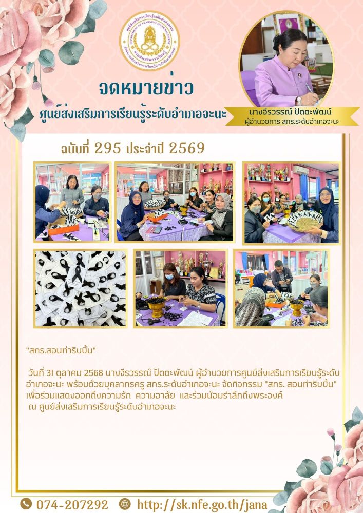 | วันที่ 31 ตุลาคม 2568 นางจีรวรรณ์ ปัตตะพัฒน์ ผู้อำนวยการศูนย์ส่งเสริมการเรียนรู้ระดับอำเภอจะนะ พร้อมด้วยบุคลากรครู สกร.ระดับอำเภอจะนะ จัดกิจกรรม "สกร. สอนทำริบบิ้น" เพื่อร่วมแสดงออกถึงความรัก  ความอาลัย  และร่วมน้อมรำลึกถึงพระองค์ เพื่อแจกจ่ายให้แก่ประชาชนในพื้นที่ ณ ศูนย์ส่งเสริมการเรียนรู้ระดับอำเภอจะนะ