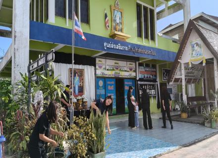 นางสาวธัญญ์ลักษณ์ ขจรสกุลวงศ์ ผู้อำนวยการศูนย์ส่งเสริมการเรียนรู้ระดับอำเภอควนเนียง พร้อมด้วยคณะครู และบุคลากร ร่วมทำกิจกรรม มอบริบบิ้นดำถวายอาลัย ให้กับผู้ที่มาร่วมบุญทอดกฐิน จำนวน 90 ชิ้น
