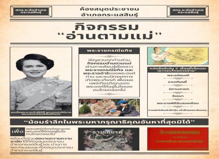 สกร.ระดับบอำเภอกระแสสินธุ์ และห้องสมุดประชาชนอำเภอกระแสสินธุ์ ขอเชิญชวนกิจกรรม”อ่านตามแม่” เพื่อน้อมรำลึกในพระมหากรุณาธิคุณสมเด็จพระนางเจ้าสิริกิติ์ พระบรมรานิชีนาถ พระบรมราชชนนีพระพันปีหลวง  เข้าชม :  [18]