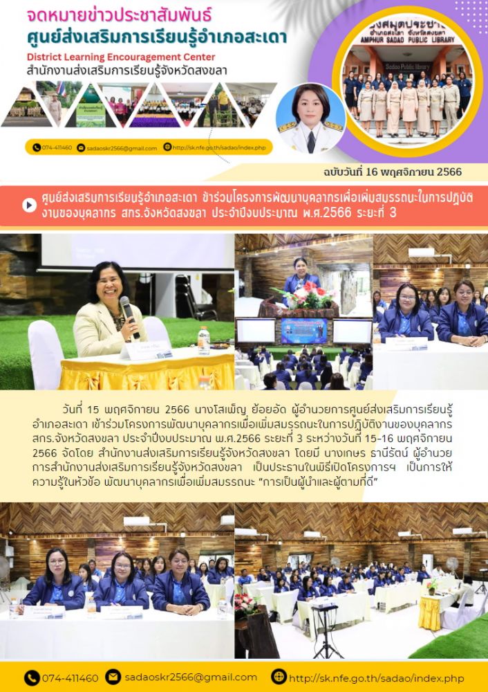ศูนย์ส่งเสริมการเรียนรู้อำเภอสะเดา เข้าร่วมโครงการพัฒนาบุคลากรเพื่อเพิ่มสมรรถนะในการปฏิบัติงานของบุคลากร สกร.จังหวัดสงขลา ประจำปีงบประมาณ พ.ศ.2566 ระยะที่ 3