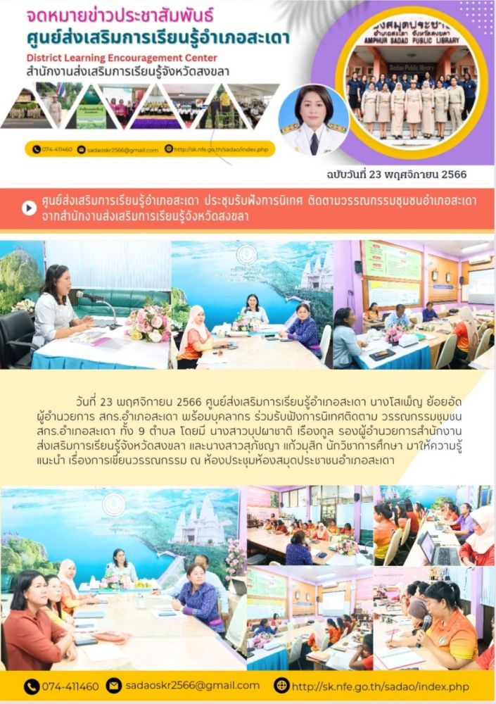 ศูนย์ สกร.ระดับอำเภอสะเดา วันที่ 23 พฤศจิกายน 2566 ศูนย์ส่งเสริมการเรียนรู้อำเภอสะเดา นางโสเพ็ญ ย้อยอัด ผู้อำนวยการ สกร.อำเภอสะเดา พร้อมบุคลากร ร่วมรับฟังการนิเทศติดตาม วรรณกรรมชุมชน สกร.อำเภอสะเดา ทั้ง 9 ตำบล โดยมี นางสาวบุปผาชาติ เรืองกูล รองผู้อำนวยการสำนักงานส่งเสริมการเรียนรู