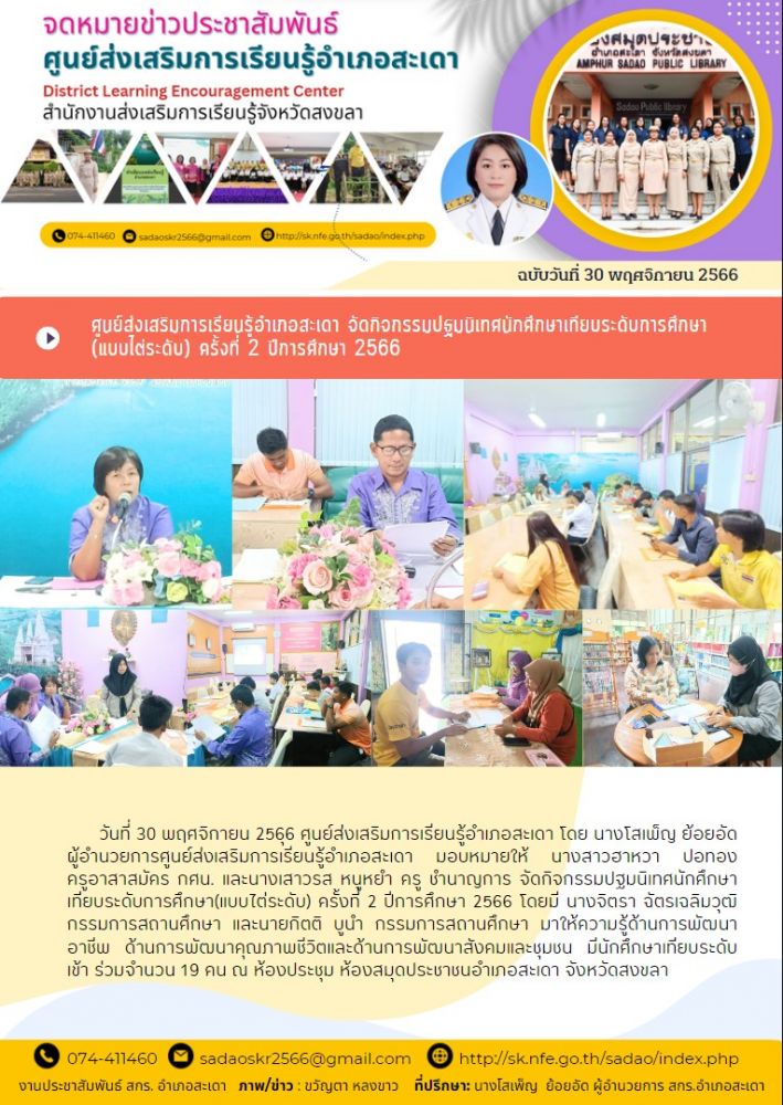 ศูนย์ส่งเสริมการเรียนรู้อำเภอสะเดา จัดกิจกรรมปฐมนิเทศนักศึกษาเทียบระดับการศึกษา (แบบไต่ระดับ) ครั้งที่ 2 ปีการศึกษา 2566
