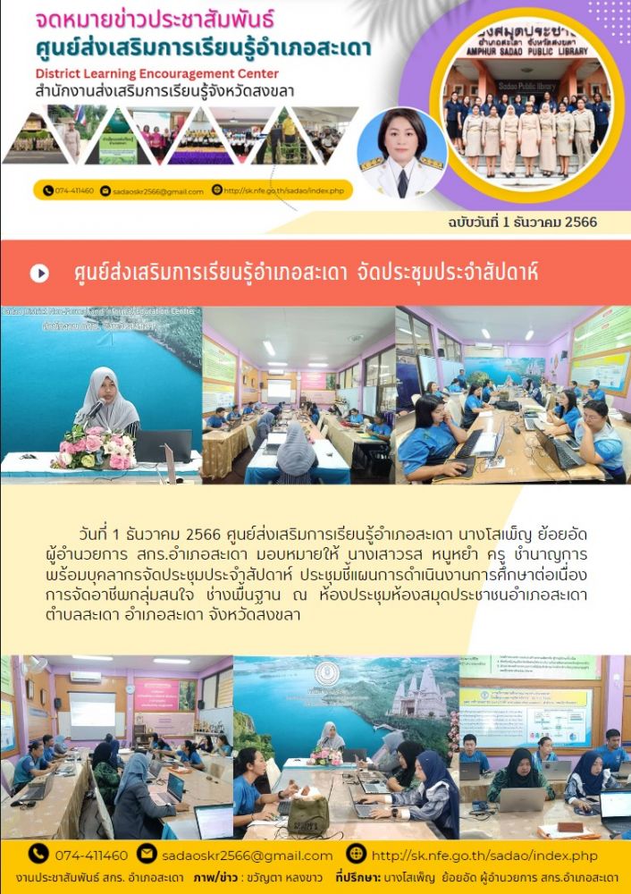 ศูนย์ สกร.ระดับอำเภอสะเดา วันที่ 1 ธันวาคม 2566 ศูนย์ส่งเสริมการเรียนรู้อำเภอสะเดา นางโสเพ็ญ ย้อยอัด ผู้อำนวยการ สกร.อำเภอสะเดา มอบหมายให้ นางเสาวรส หนูหยำ ครู ชำนาญการ พร้อมบุคลากรจัดประชุมประจำสัปดาห์ ประชุมชี้แผนการดำเนินงานการศึกษาต่อเนื่อง การจัดอาชีพกลุ่มสนใจ ช่างพื้นฐาน ณ ห