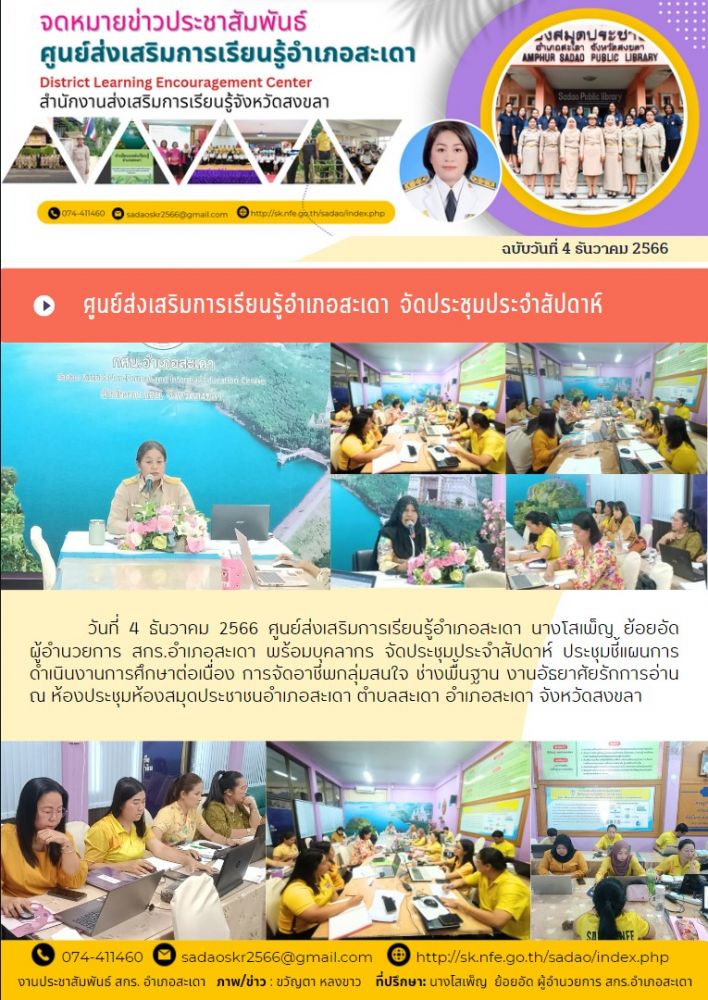 ศูนย์ สกร.ระดับอำเภอสะเดา วันที่ 4 ธันวาคม 2566 ศูนย์ส่งเสริมการเรียนรู้อำเภอสะเดา นางโสเพ็ญ ย้อยอัด ผู้อำนวยการ สกร.อำเภอสะเดา พร้อมบุคลากร จัดประชุมประจำสัปดาห์ ประชุมชี้แผนการดำเนินงานการศึกษาต่อเนื่อง การจัดอาชีพกลุ่มสนใจ ช่างพื้นฐาน งานอัธยาศัยรักการอ่าน ณ ห้องประชุมห้องสมุดป