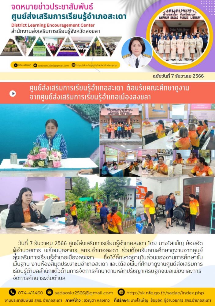 ศูนย์ สกร.ระดับอำเภอสะเดา วันที่ 7 ธันวาคม 2566 ศูนย์ส่งเสริมการเรียนรู้อำเภอสะเดา โดย นางโสเพ็ญ ย้อยอัด ผู้อำนวยการ พร้อมบุคลากร สกร.อำเภอสะเดา ร่วมต้อนรับคณะศึกษาดูงาน จาก ศูนย์ส่งเสริมการเรียนรู้อำเภอเมืองสงขลา ซึ่งได้ศึกษาดูงานในส่วนของงานการศึกษาขั้นพื้นฐาน งานห้องสมุดประชาช