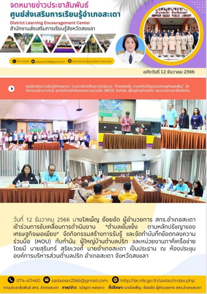 ศูนย์ สกร.ระดับอำเภอสะเดา วันที่ 12 ธันวาคม 2566 นางโสเพ็ญ ย้อยอัด ผู้อำนวยการ สกร.อำเภอสะเดา เข้าร่วมการขับเคลื่อนการดำเนินงาน \"ตำบลเข้มแข็ง ตามหลักปรัชญาของเศรษฐกิจพอเพียง\" จัดกิจกรรมสร้างการรับรู้ และจัดทำบันทึกข้อตกลงความร่วมมือ (MOU) กับกำนัน ผู้ใหญ่บ้านตำบลปริก แ