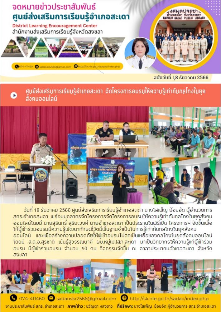 ศูนย์ สกร.ระดับอำเภอสะเดา วันที่ 18 ธันวาคม 2566 ศูนย์ส่งเสริมการเรียนรู้อำเภอสะเดา นางโสเพ็ญ ย้อยอัด ผู้อำนวยการ สกร.อำเภอสะเดา พร้อมบุคลากรจัดโครงการจัดโครงการอบรมให้ความรู้เท่าทันกลโกงในยุคสังคมออนไลน์โดยมี นายสุรินทร์ สุริยะวงศ์ นายอำเภอสะเดา เป็นประธานในพิธีเปิด โครงการฯ จ