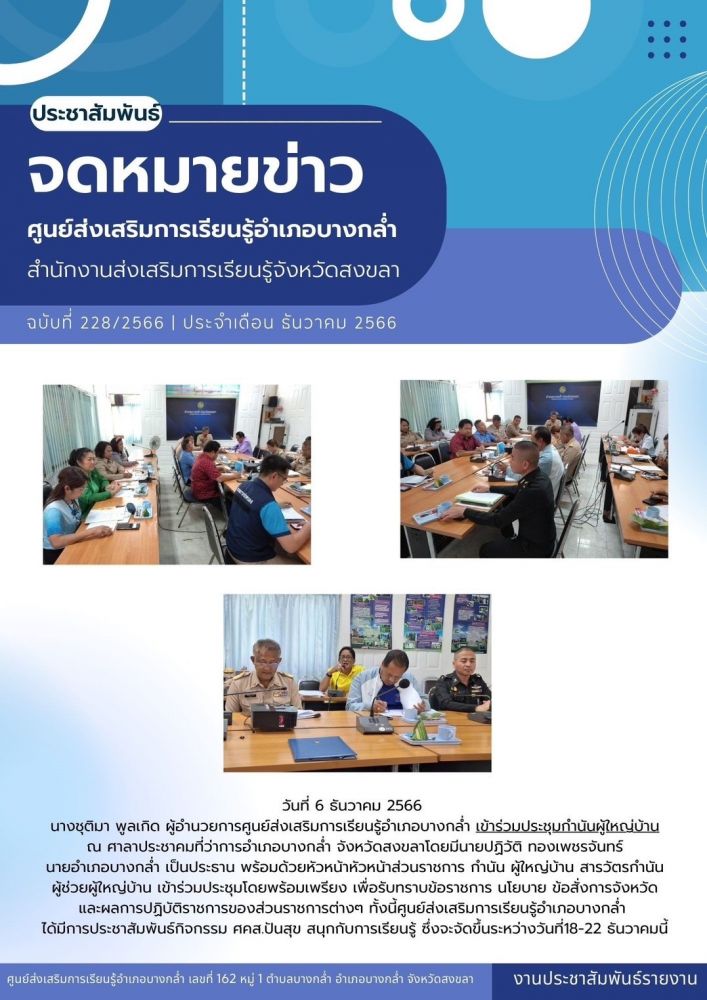 ศูนย์ สกร.ระดับอำเภอบางกล่ำ วันที่ 6 ธันวาคม 2566 นางชุติมา พูลเกิด ผู้อำนวยการศูนย์ส่งเสริมการเรียนรู้อำเภอบางกล่ำ #เข้าร่วมประชุมหัวหน้าส่วนราชการและคณะกรรมการบริหารงานอำเภอ โดยมีนายปฏิวัติ ทองเพชรจันทร์ นายอำเภอบางกล่ำ เป็นประธาน พร้อมด้วยหัวหน้าส่วนราชการ องค์กรปกครองส่วนท้องถิ่