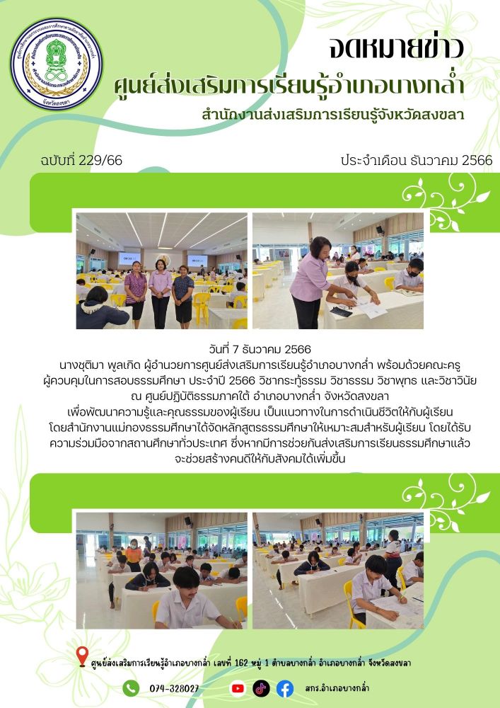 ศูนย์ สกร.ระดับอำเภอบางกล่ำ วันที่7 พฤศจิกายน 2566 นางชุติมา พูลเกิด ผู้อำนวยการศูนย์ส่งเสริมการเรียนรู้อำเภอบางกล่ำ พร้อมคณะครู ผู้ควบคุมในการสอบธรรมศึกษา ประจำปี 2566 #วิชากระทู้ธรรม วิชาธรรม วิชาพุทธ และวิชาวินัย ณ #ศูนย์ปฏิบัติธรรมภาคใต้ อำเภอบางกล่ำ จังหวัดสงขลา