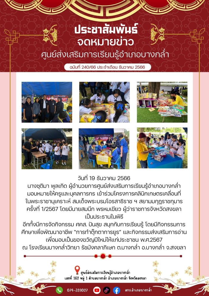 ศูนย์ สกร.ระดับอำเภอบางกล่ำ วันที่ 19 ธันวาคม 2566 นางชุติมา พูลเกิด ผู้อำนวยการศูนย์ส่งเสริมการเรียนรู้อำเภอบางกล่ำ มอบหมายให้ครูและบุคลการกร เข้าร่วมโครงการคลินิกเกษตรเคลื่อนที่ ในพระราชานุเคราะห์​ สมเด็จพระบรมโอรสาธิราช​ ฯ สยามมกุฎราชกุมาร​ ครั้งที