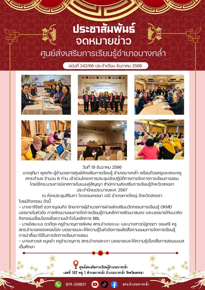 วันที่ 19 ธันวาคม 2566 นางชุติมา พูลเกิด ผู้อำนวยการศูนย์ส่งเสริมการเรียนรู้ อำเภอบางกล่ำ พร้อมด้วยครูและคณะครูศกร.ตำบล จำนวน 6 ท่าน เข้าร่วมโครงการประชุมเชิงปฏิบัติการการจัดการการเรียนการสอน โดยใช้กระบวนการนิเทศภายในแบบคู่สัญญา สำนักงานส่งเสริมการเรียน