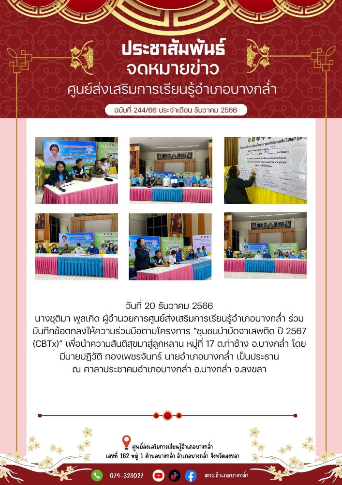 ศูนย์ สกร.ระดับอำเภอบางกล่ำ วันที่ 20 ธันวาคม 2566 นางชุติมา พูลเกิด ผู้อำนวยการศูนย์ส่งเสริมการเรียนรู้อำเภอบางกล่ำ ร่วมบันทึกข้อตกลงให้ความร่วมมือตามโครงการ ชุมชนบำบัดจาเสพติด ปี 2567 (CBTx) เพื่อนำความสันติสุขมาสู่ลูกหลาน หมู่ที่ 17 ต.ท่าช้าง อ.บางกล่ำ โดยมีนายปฏิวัติ ทองเพชรจั