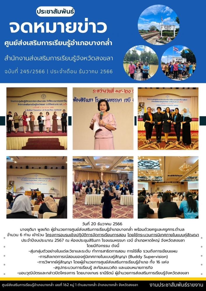 ศูนย์ สกร.ระดับอำเภอบางกล่ำ วันที่ 19 ธันวาคม 2566 นางชุติมา พูลเกิด ผู้อำนวยการศูนย์ส่งเสริมการเรียนรู้ อำเภอบางกล่ำ พร้อมด้วยครูและคณะครูศกร.ตำบล จำนวน 6 ท่าน เข้าร่วมโครงการประชุมเชิงปฏิบัติการการจัดการการเรียนการสอน โดยใช้กระบวนการนิเทศภายในแบบคู่สัญญา สำนักงานส่งเสริมการเรียน