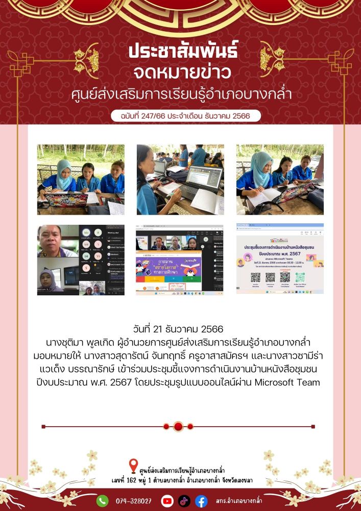 ศูนย์ สกร.ระดับอำเภอบางกล่ำ วันที่ 21 ธันวาคม 2566 นางชุติมา พูลเกิด ผู้อำนวยการศูนย์ส่งเสริมการเรียนรู้อำเภอบางกล่ำ มอบหมายให้ นางสาวสุดารัตน์ จันทฤทธิ์ ครูอาสาสมัครฯ และนางสาวซามีร่า แวเด็ง บรรณารักษ์ เข้าร่วมประชุมชี้แจงการดำเนินงานบ้านหนังสือชุมชน ปีงบประมาณ พ.ศ. 2567 โดยประชุม