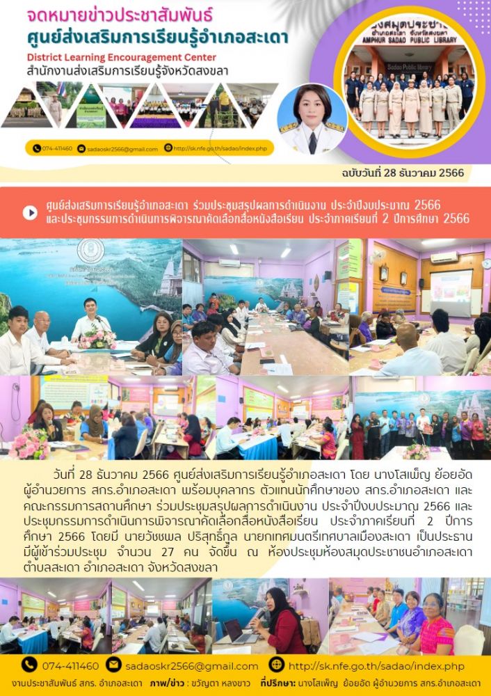 ศูนย์ สกร.ระดับอำเภอสะเดา ศูนย์ส่งเสริมการเรียนรู้อำเภอสะเดา ร่วมประชุมสรุปผลการดำเนินงาน ประจำปีงบประมาณ 2566 และประชุมกรรมการดำเนินการพิจารณาคัดเลือกสื่อหนังสือเรียน ประจำภาคเรียนที่ 2 ปีการศึกษา 2566