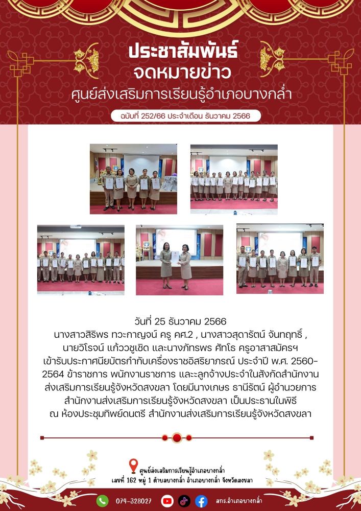 ศูนย์ สกร.ระดับอำเภอบางกล่ำ วันที่ 25 ธันวาคม 2566 นางสาวสิริพร ทวะกาญจน์ ครู คศ.2 , นางสาวสุดารัตน์ จันทฤทธิ์ , นายวิโรจน์ แก้ววชูเชิด และนางภัทรพร ศัทโธ ครูอาสาสมัครฯ #เข้ารับประกาศนียบัตรกำกับเครื่องราชอิสริยาภรณ์ ประจำปี พ.ศ.2560-2564