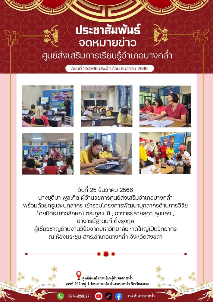 วันที่ 25 ธันวาคม 2566 นางชุติมา พูลเกิด ผู้อำนวยการศูนย์ส่งเสริมอำเภอบางกล่ำ พร้อมด้วยครูและบุคลากร เข้าร่วมโครงการพัฒนาบุคลากรด้านการวิจัย