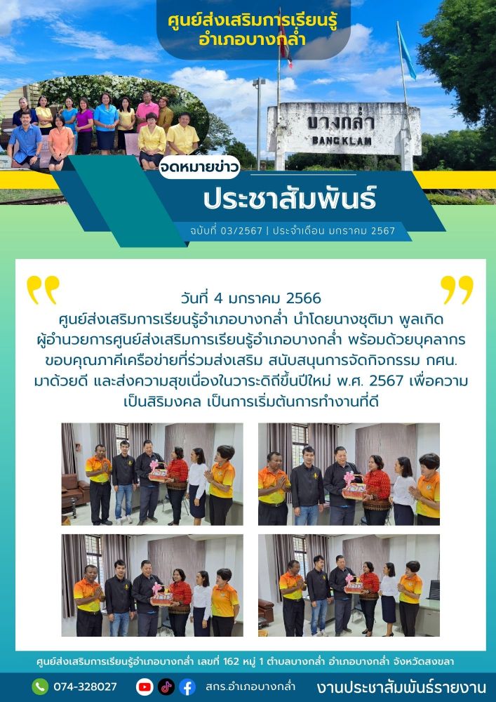 ศูนย์ สกร.ระดับอำเภอบางกล่ำ วันที่ 4 มกราคม 2566 ศูนย์ส่งเสริมการเรียนรู้อำเภอบางกล่ำ นำโดยนางชุติมา พูลเกิด ผู้อำนวยการศูนย์ส่งเสริมการเรียนรู้อำเภอบางกล่ำ พร้อมด้วยบุคลากร ขอบคุณภาคีเครือข่ายที่ร่วมส่งเสริม สนับสนุนการจัดกิจกรรม กศน. มาด้วยดี และส่งความสุขเนื่องในวาระดิถีขึ้นปีใหม