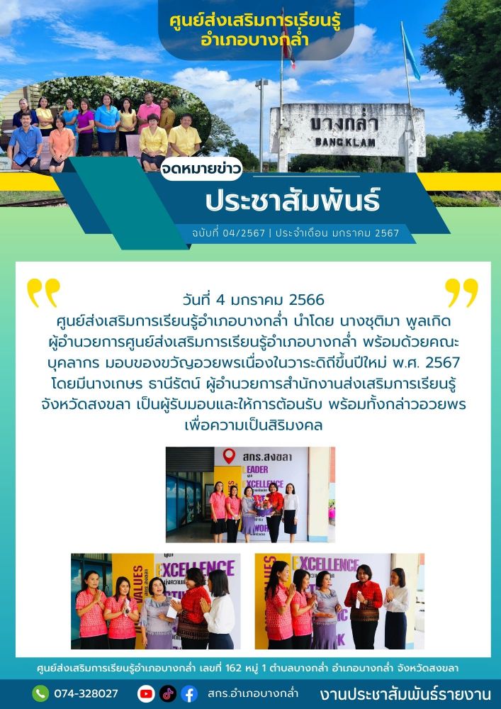 ศูนย์ สกร.ระดับอำเภอบางกล่ำ วันที่ 4 มกราคม 2566 ศูนย์ส่งเสริมการเรียนรู้อำเภอบางกล่ำ นำโดย นางชุติมา พูลเกิด ผู้อำนวยการศูนย์ส่งเสริมการเรียนรู้อำเภอบางกล่ำ พร้อมด้วยคณะบุคลากร มอบของขวัญอวยพรเนื่องในวาระดิถีขึ้นปีใหม่ พ.ศ. 2567 โดยมีนางเกษร ธานีรัตน์ ผู้อำนวยการสำนักงานส่งเสริมกา