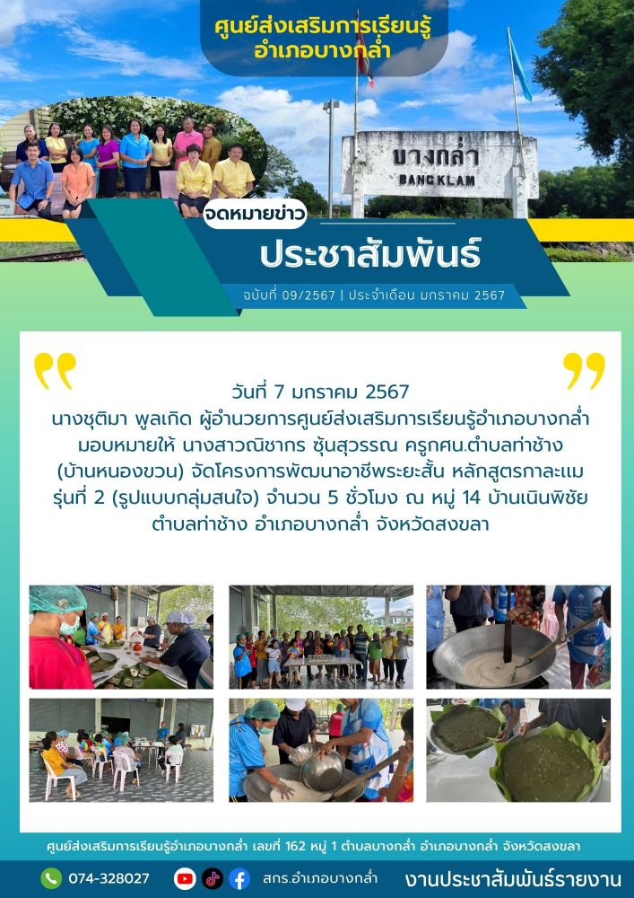 ศูนย์ สกร.ระดับอำเภอบางกล่ำ วันที่ 7 มกราคม 2567 นางชุติมา พูลเกิด ผู้อำนวยการศูนย์ส่งเสริมการเรียนรู้อำเภอบางกล่ำ มอบหมายให้ นางสาวณิชากร ซุ้นสุวรรณ ครูกศน.ตำบลท่าช้าง(บ้านหนองขวน) จัดโครงการพัฒนาอาชีพระยะสั้น หลักสูตรกาละเเม รุ่นที่2(รูปแบบกลุ่มสนใจ) จำนวน 5 ชั่วโมง ณ หมู่ 14 บ้า