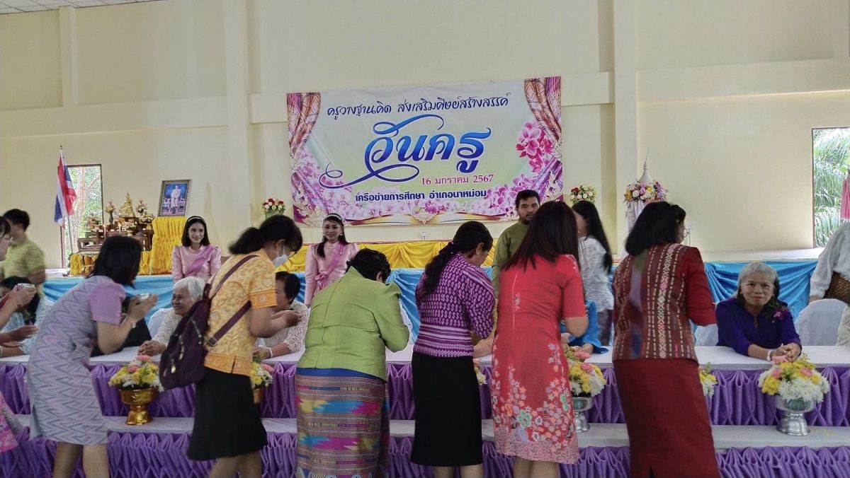 วันที่ 16 มกราคม 2567 นางสุนิตย์ ไชยถาวร ผู้อำนวยการศูนย์ส่งเสริมการเรียนรู้อำเภอนาหม่อม มอบหมายให้ นางสาวสมสมร บัวชื่น ครูอาสาสมัคร กศน. และนายอัฆเดช ครุวรรณพัฒน์ นักจัดการงานทั่วไป เข้าร่วมพิธีเนื่องในงานวันครู ครั้งที่ 68 ประจำปี 2567 ซึ่งจัดโดยศูนย์เครือข่ายการศึกษาอำเภอนาหม่อม โดยมีนางลักขณา เสริมสุข รองผู้อำนายสำนักงานเขตพื้นที่ประถมศึกษา สงขลา เขต1 เป็นประธานในพิธี ณ โรงเรียนธรรมโฆษิต อำเภอนาหม่อม จังหวัดสงขลา