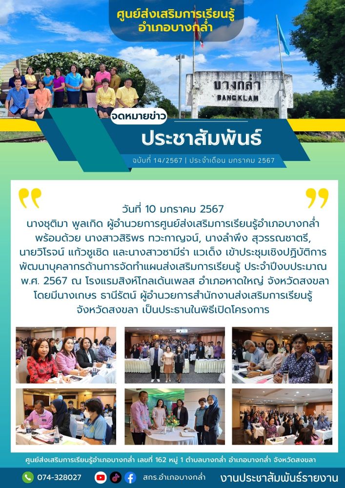 ศูนย์ สกร.ระดับอำเภอบางกล่ำ วันที่ 10 มกราคม 2567 ศูนย์ส่งเสริมการเรียนรู้อำเภอบางกล่ำ เข้าประชุมเชิงปฏิบัติการพัฒนาบุคลากรด้านการจัดทำแผนส่งเสริมการเรียนรู้ ประจำปีงบประมาณ พ.ศ. 2567 ณ โรงแรมสิงห์โกลเด้นเพลส อำเภอหาดใหญ่ จังหวัดสงขลา