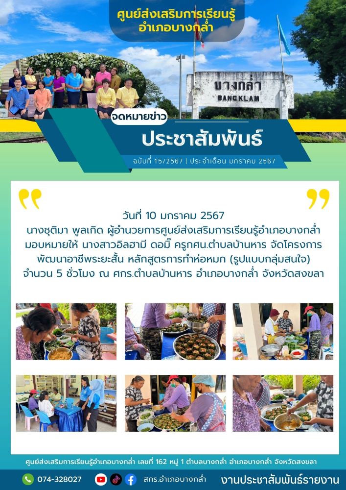 ศูนย์ สกร.ระดับอำเภอบางกล่ำ วันที่ 10 มกราคม 2567 นางชุติมา พูลเกิด ผู้อำนวยการศูนย์ส่งเสริมการเรียนรู้อำเภอบางกล่ำ มอบหมายให้ นางสาวอิลฮามี ดอมิ๊ ครูกศน.ตำบลบ้านหาร จัดโครงการพัฒนาอาชีพระยะสั้น หลักสูตรการทำห่อหมก (รูปแบบกลุ่มสนใจ) จำนวน 5 ชั่วโมง ณ ศกร.ตำบลบ้านหาร