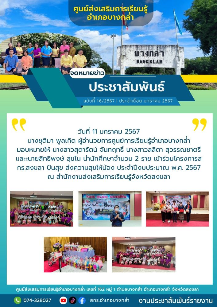 ศูนย์ สกร.ระดับอำเภอบางกล่ำ วันที่ 11 มกราคม 2567 นางชุติมา พูลเกิด ผู้อำนวยการศูนย์การเรียนรู้อำเภอบางกล่ำ มอบหมายให้ นางสาวสุดารัตน์ จันทฤทธิ์ นางสาวลลิตา สุวรรณชาตรี และะนายสิทธิพงษ์ สุขโน นำนักศึกษาจำนวน 2 ราย เข้าร่วมโครงการสกร.สงขลา ปันสุข ส่งความสุขให้น้อง ประจำปีงบประมาณ พ