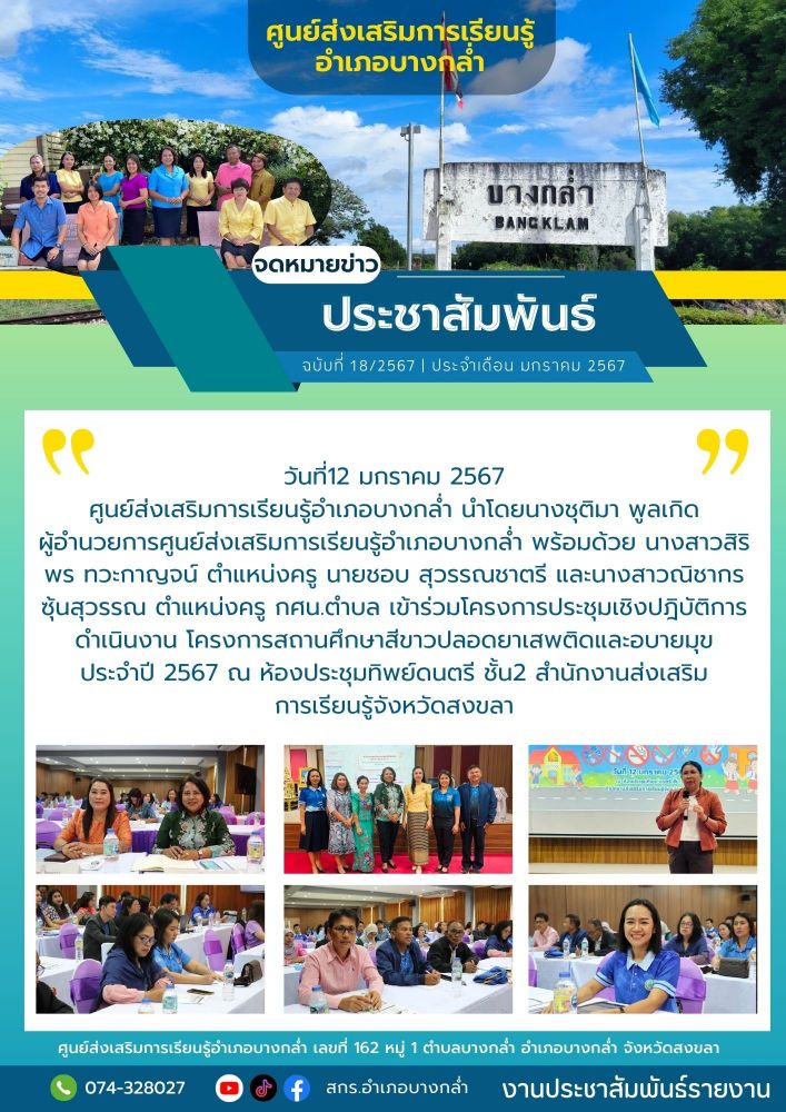 ศูนย์ สกร.ระดับอำเภอบางกล่ำ วันที่12 มกราคม 2567 ศูนย์ส่งเสริมการเรียนรู้อำเภอบางกล่ำ เข้าร่วมโครงการประชุมเชิงปฎิบัติการดำเนินงาน โครงการสถานศึกษาสีขาวปลอดยาเสพติดและอบายมุข ประจำปี 2567 ณ ห้องประชุมทิพย์ดนตรี ชั้น2 สำนักงานส่งเสริม การเรียนรู้จังหวัดสงขลา