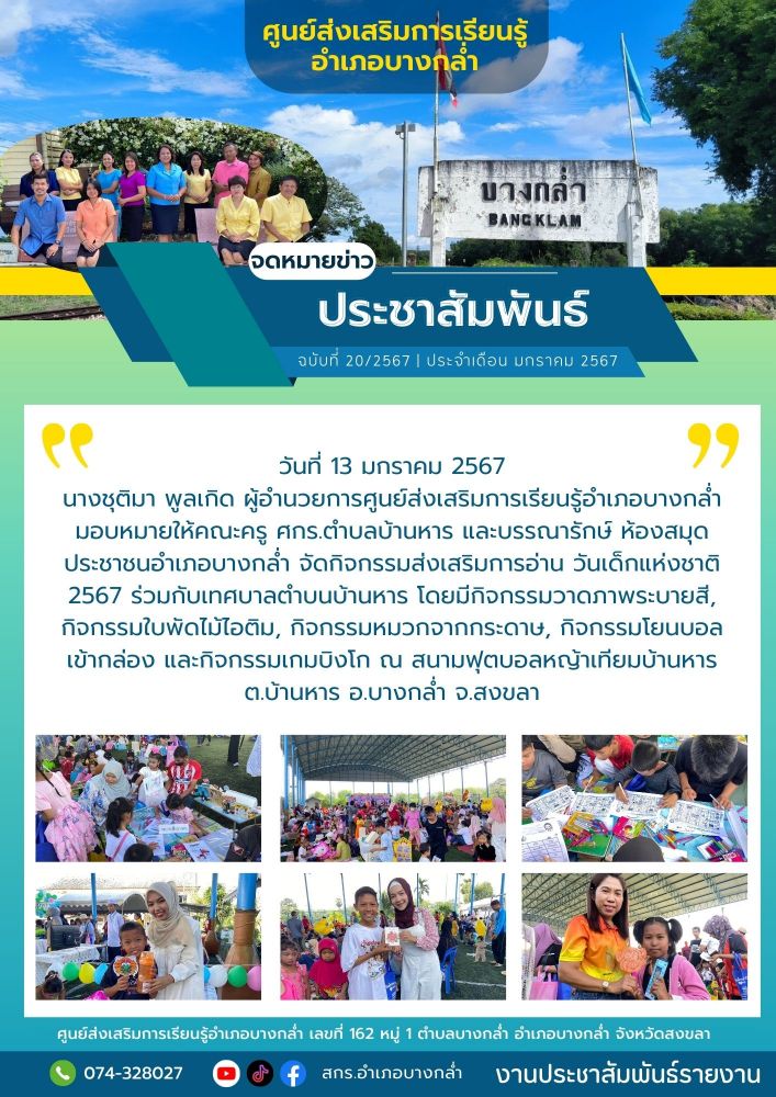 ศูนย์ สกร.ระดับอำเภอบางกล่ำ วันที่ 13 มกราคม 2567 นางชุติมา พูลเกิด ผู้อำนวยการศูนย์ส่งเสริมการเรียนรู้อำเภอบางกล่ำ มอบหมายให้คณะครู ศกร.ตำบลบ้านหาร และบรรณารักษ์ ห้องสมุดประชาชนอำเภอบางกล่ำ จัดกิจกรรมส่งเสริมการอ่าน วันเด็กแห่งชาติ 2567 ร่วมกับเทศบาลตำบนบ้านหาร