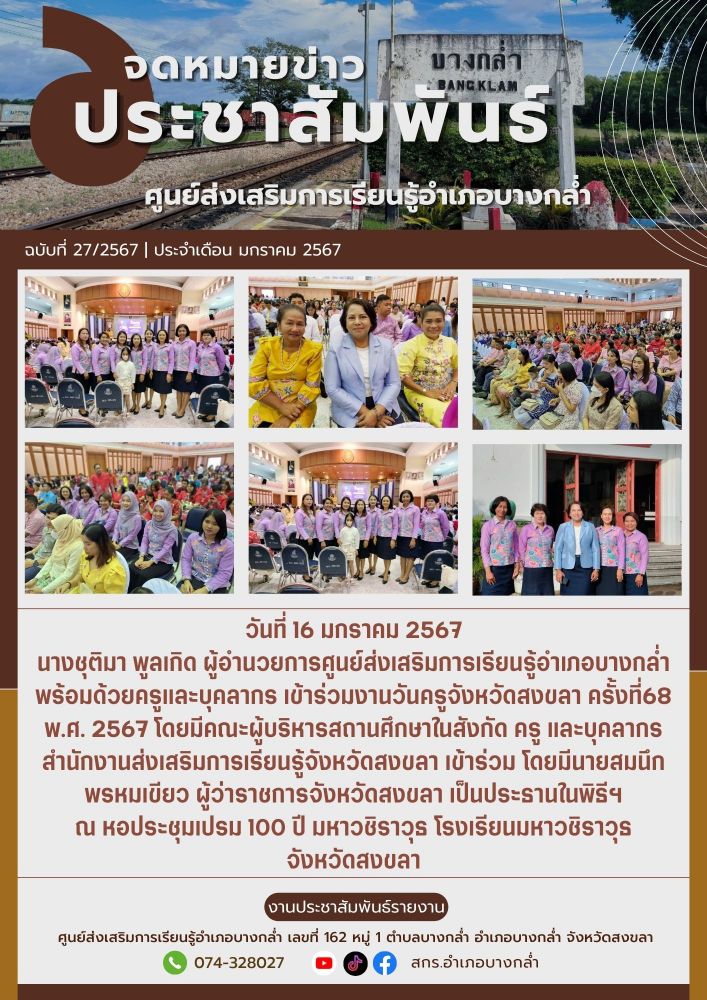 ศูนย์ สกร.ระดับอำเภอบางกล่ำ วันที่ 16 มกราคม 2567 บุคลากรศูนย์ส่งเสริมการเรียนรู้อำเภอบางกล่ำ เข้าร่วมงานวันครูจังหวัดสงขลา ครั้งที่68 พ.ศ. 2567 ณ หอประชุมเปรม 100 ปี มหาวชิราวุธ โรงเรียนมหาวชิราวุธ จังหวัดสงขลา