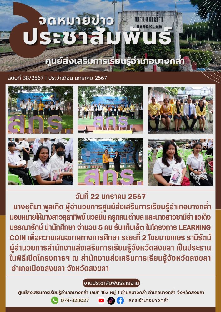 ศูนย์ สกร.ระดับอำเภอบางกล่ำ นางชุติมา พูลเกิด ผู้อำนวยการศูนย์ส่งเสริมการเรียนรู้อำเภอบางกล่ำ มอบหมายให้นางสาวสุธาทิพย์ นวลนิ่ม ครูกศน.ตำบล และนางสาวซามีร่า เเวเด็ง บรรณารักษ์ นำนักศึกษา จำนวน 5 คน รับแท็บเล็ต ในโครงการ Learning Coin เพื่อความเสมอภาคทางการศึกษา ระยะที่ 2