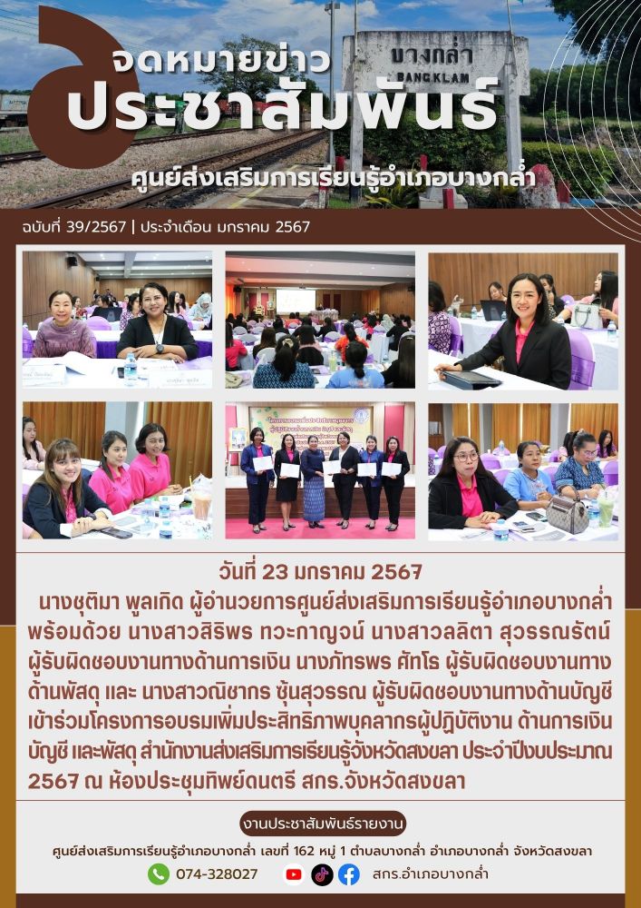 ศูนย์ สกร.ระดับอำเภอบางกล่ำ วันที่ 23 มกราคม 2567 ศูนย์ส่งเสริมการเรียนรู้อำเภอบางกล่ำ ข้าร่วมโครงการอบรมเพิ่มประสิทธิภาพบุคลากรผู้ปฏิบัติงาน ด้านการเงิน บัญชี และพัสดุ สำนักงานส่งเสริมการเรียนรู้จังหวัดสงขลา ประจำปีงบประมาณ 2567 ณ ห้องประชุมทิพย์ดนตรี สกร.จังหวัดสงขลา