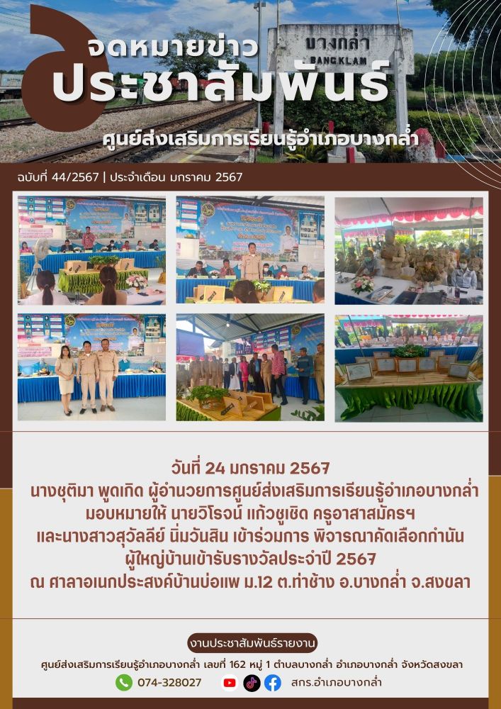 ศูนย์ สกร.ระดับอำเภอบางกล่ำ วันที่ 24 มกราคม 2567 นางชุติมา พูดเกิด ผู้อำนวยการศูนย์ส่งเสริมการเรียนรู้อำเภอบางกล่ำ มอบหมายให้ นายวิโรจน์ เเก้วชูเชิด ครูอาสาสมัครฯ และนางสาวสุวัลลีย์ นิ่มวันสิน เข้าร่วมการ พิจารณาคัดเลือกกำนัน ผู้ใหญ่บ้านเข้ารับรางวัลประจำปี 2567 ณ ศาลาอเนกประสง