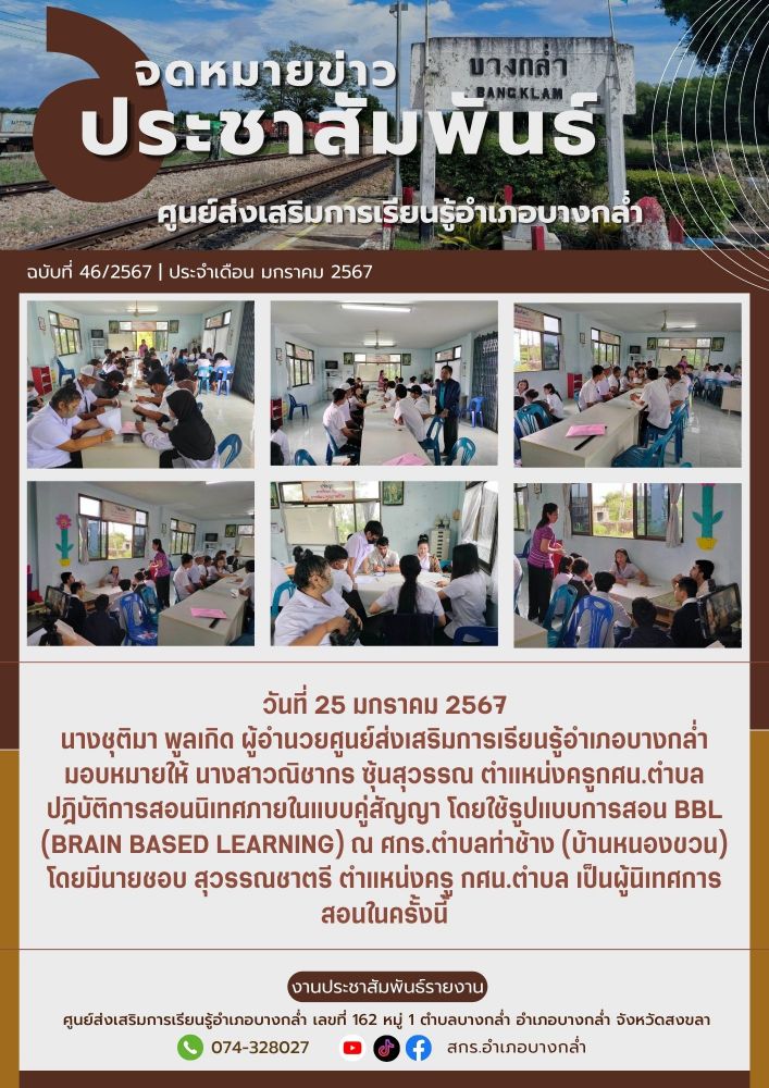 ศูนย์ สกร.ระดับอำเภอบางกล่ำ วันที่ 25 มกราคม 2567 นางชุติมา พูลเกิด ผู้อำนวยศูนย์ส่งเสริมการเรียนรู้อำเภอบางกล่ำ มอบหมายให้ นางสาวณิชากร ซุ้นสุวรรณ ตำแหน่งครูกศน.ตำบล ปฎิบัติการสอนนิเทศภายในแบบคู่สัญญา โดยใช้รูปแบบการสอน BBL (Brain Based Learning) ณ ศกร.ตำบลท่าช้าง (บ้านหนองขวน) โ