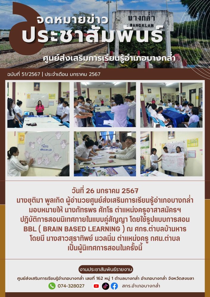 ศูนย์ สกร.ระดับอำเภอบางกล่ำ วันที่ 26 มกราคม 2567 นางชุติมา พูลเกิด ผู้อำนวยศูนย์ส่งเสริมการเรียนรู้อำเภอบางกล่ำ มอบหมายให้ นางภัทรพร ศัทโธ ตำแหน่งครูอาสาสมัครฯ ปฎิบัติการสอนนิเทศภายในแบบคู่สัญญา โดยใช้รูปแบบการสอน BBL ( Brain Based Learning ) ณ ศกร.ตำบลบ้านหาร โดยมี นางสาวสุธาท